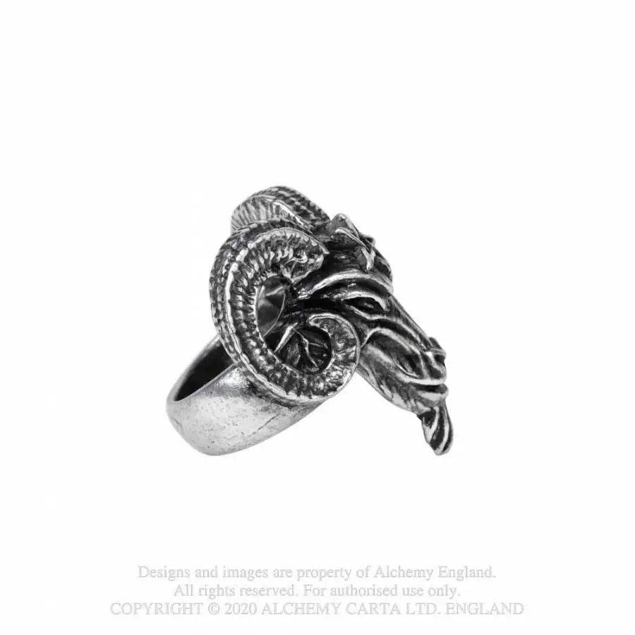 Une grosse bague en Ă©tain vieilli reprĂ©sentant une tĂȘte de chĂšvre Ă cornes avec un pentagramme sur le front, le fameux Baphomet !