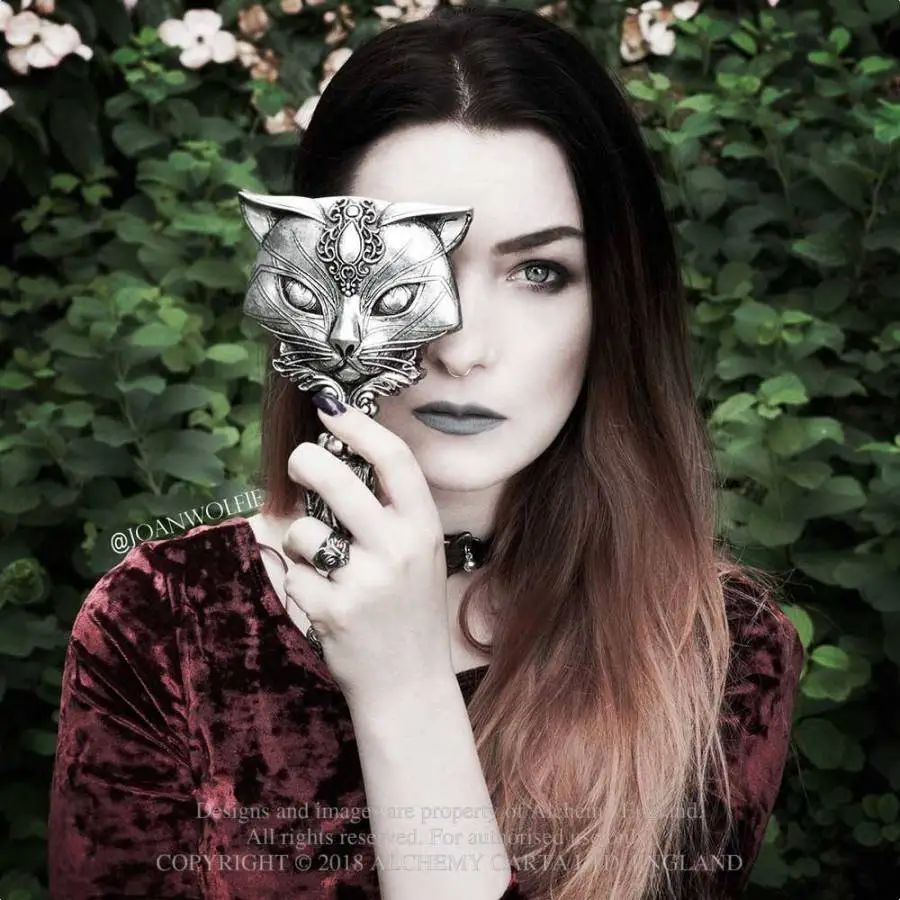 Un anneau de tĂȘte de chat en Ă©tain noir partiellement Ă©clairĂ©, avec ses yeux en amande de cristaux Swarovski rouges