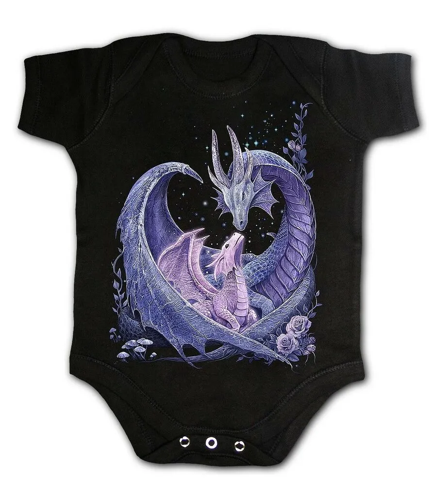 L’aile protectrice d’un dragon majestueux berce sa progĂ©niture, formant la forme d’un coeur autour d’eux deux.