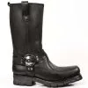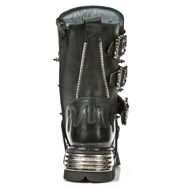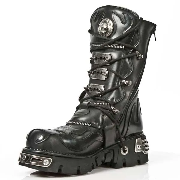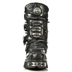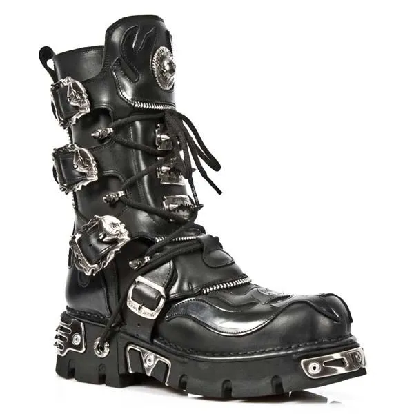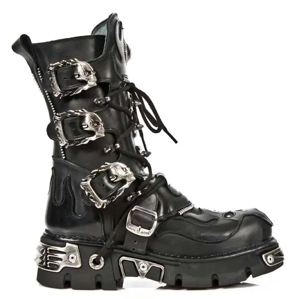 Du 100% trash, 100% mĂ©tal, 100% goth, bref du 100% new rock pour cette paire de bottes en cuir noir, elles sont dĂ©corĂ©es d’une grande piĂšce de cuir en forme de skull sur l’avant, les boucles en mĂ©tal sont en forme de tĂȘtes de mort