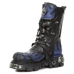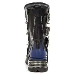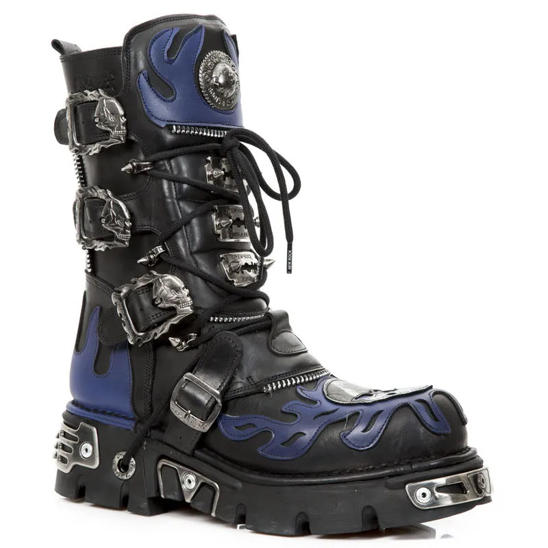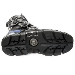 Les New rock M.1007-C2 sont dĂ©corĂ©e de lames de rasoir, de boucles mĂ©talliques en forme de tĂȘtes de mort, de zips de dĂ©coration et d’un grand skull en cuir gris sur l’avant des bottes