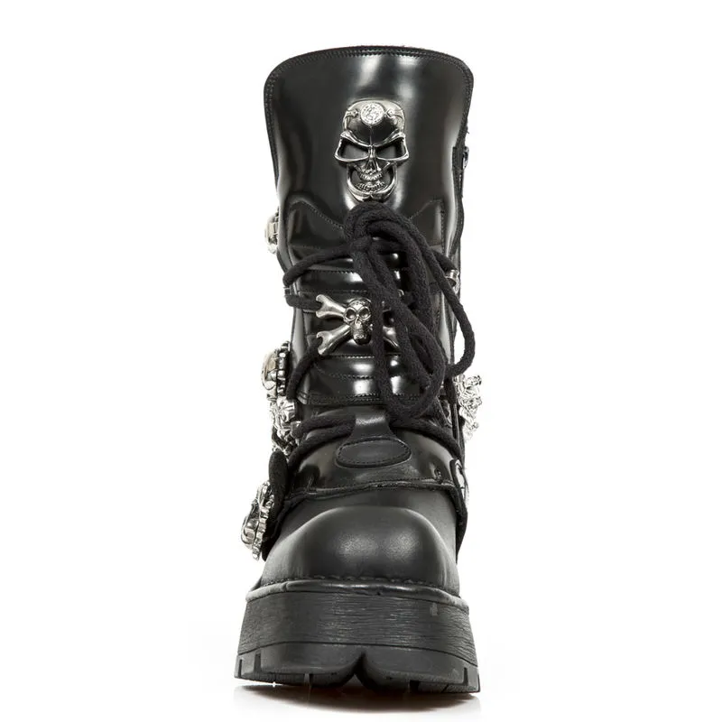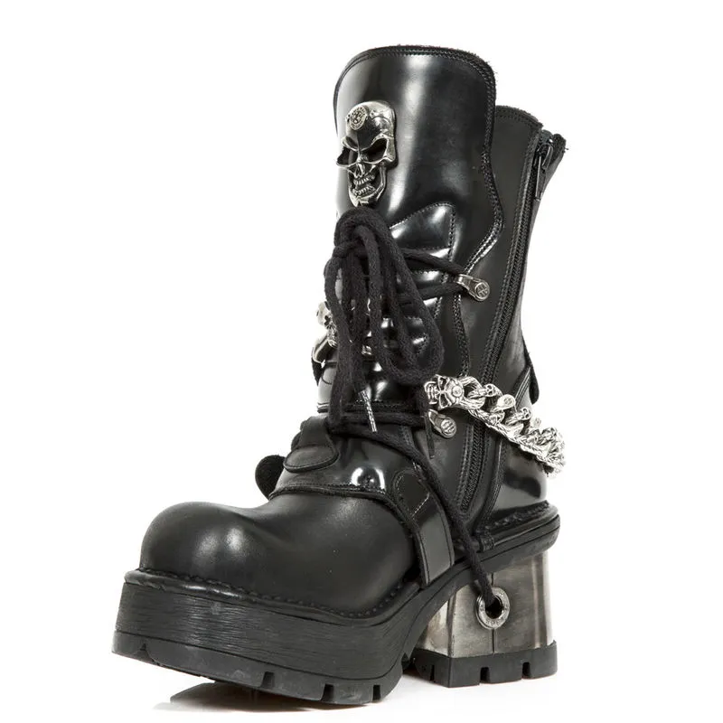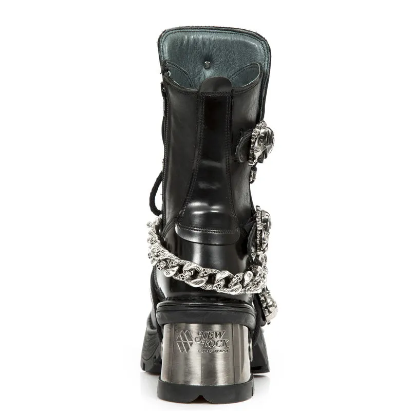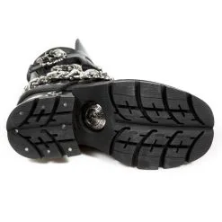 Vous voulez du goth pur et dur ? Alors que pensez-vous de ce modĂšle ? Boucles en forme de tĂȘtes de mort, larges talons mĂ©talliques, semelles compensĂ©es, gros skull frontal, chaĂźne de dĂ©coration Ă gros maillons: la totale pour cette paire de New rock M.1074-C1