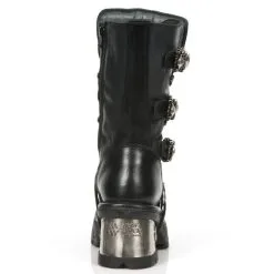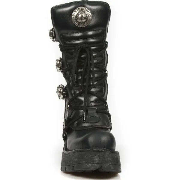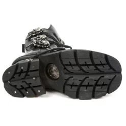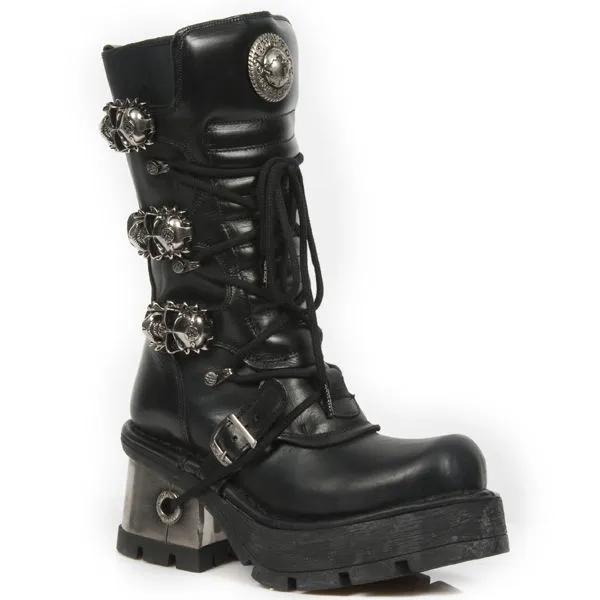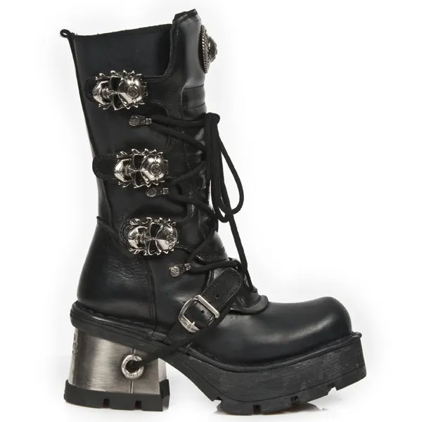 Paire de bottes en cuir noir haute qualitĂ© avec semelles compensĂ©es et gros talons mĂ©talliques, elles possĂšdent 3 Ă©normes boucles mĂ©talliques en forme de tĂȘtes de mort, pour un total look goth