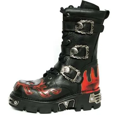 Cette paire de bottes en cuir new rock est dans la pure lignĂ©e de la marque, les fameuses semelles reactor sont lĂ , les boucles spĂ©cifiques en forme de skull, les flammes rouges et le gros skull cousu sur l’avant, voilĂ de quoi ne pas passer inaperçu !