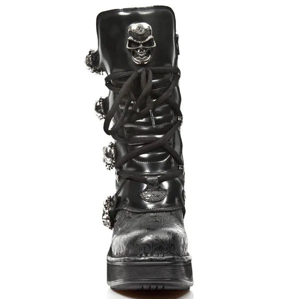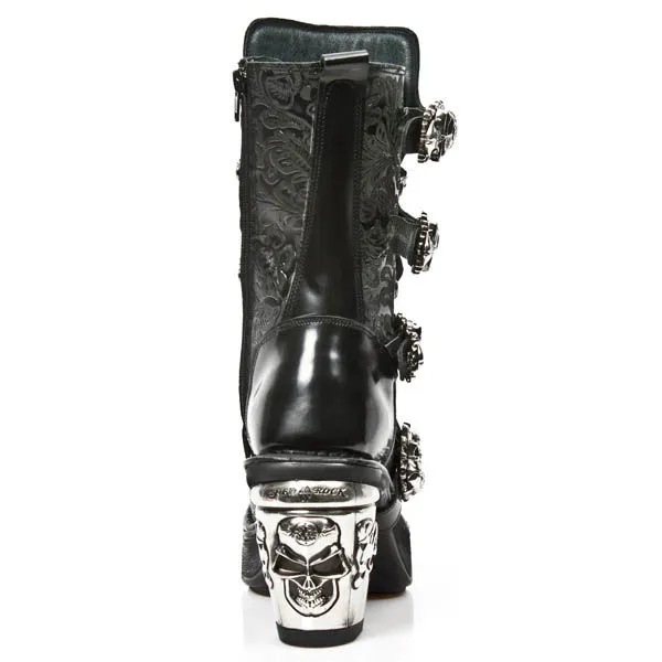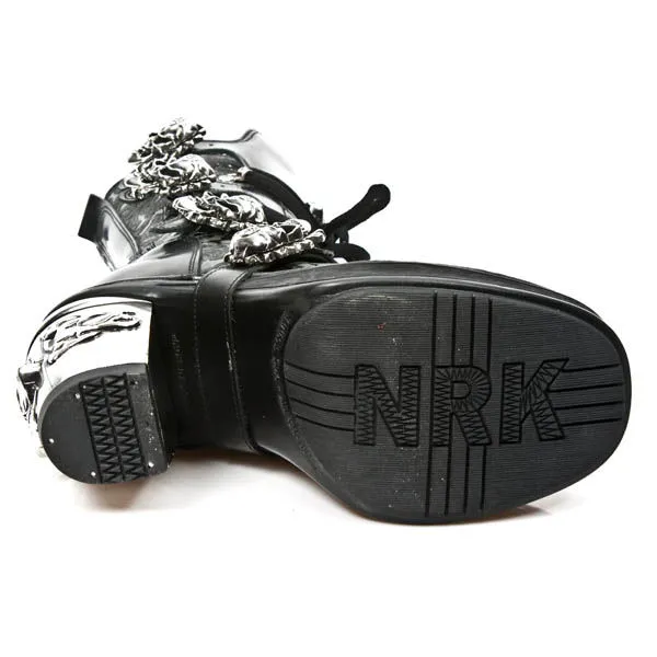 Comme si cela ne suffisait pas New Rock Ă dĂ©cidĂ© d’en ajouter un Ă©norme sur l’avant de la botte, encore trop discret pour vous ? Qu’Ă cela ne tienne, le llarge talon en mĂ©tal est Ă©galement ornĂ© d’un skull !