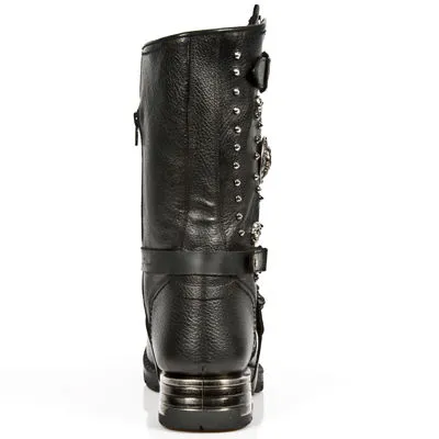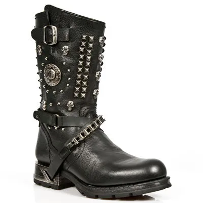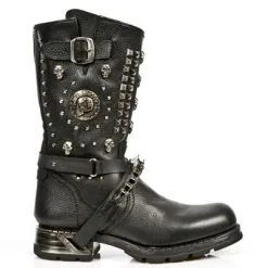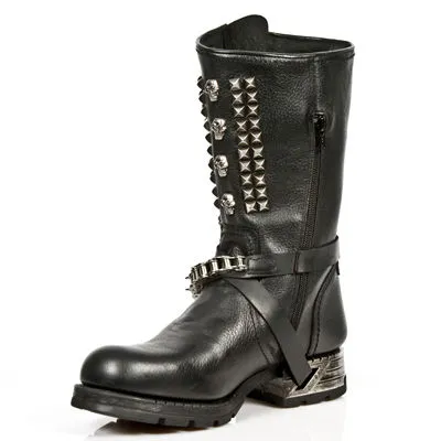 Tout l’esprit new rock dans ces bottes en cuir de style biker, les nombreux clous pyramides ainsi que les tĂȘtes de mort, les talons en mĂ©tal et pour finir une chaĂźne de vĂ©lo, amateurs de look discret et passe-partout, passez votre chemin car ces bottes cuir ne passeront pas inaperçu !
