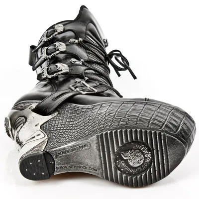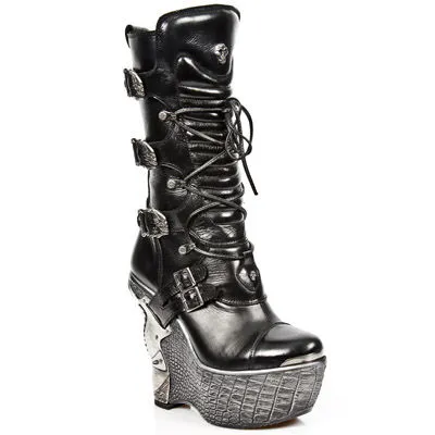 Bottes en cuir noir avec grosses semelles compensĂ©es, le talon est dĂ©corĂ© d’une grand plaque de mĂ©tal, boucles de sangles en forme de skull, laçage frontal, fermeture Ă©clair intĂ©rieure