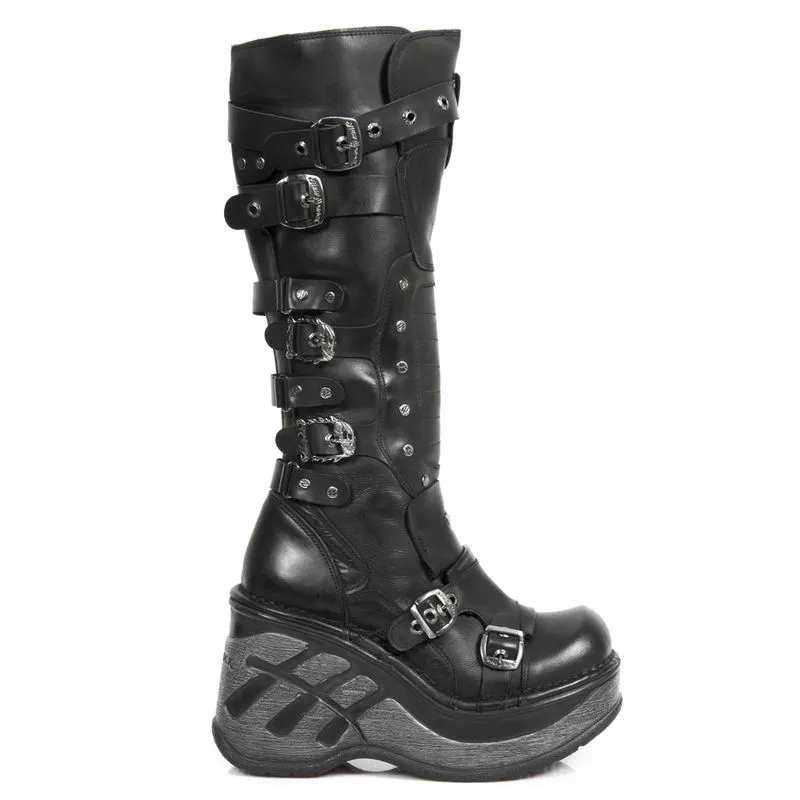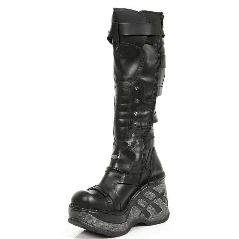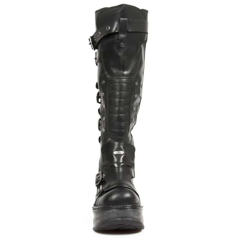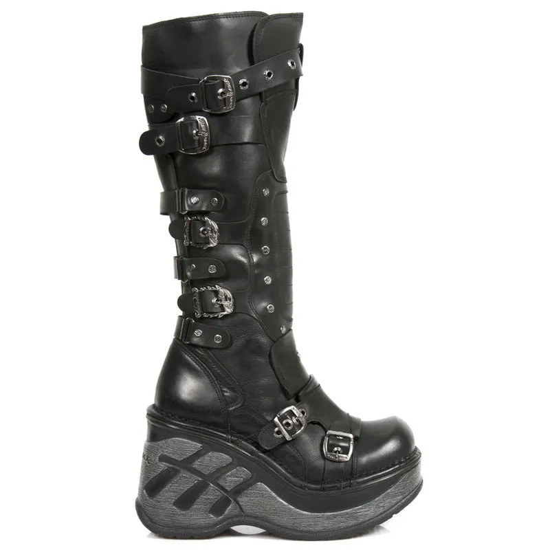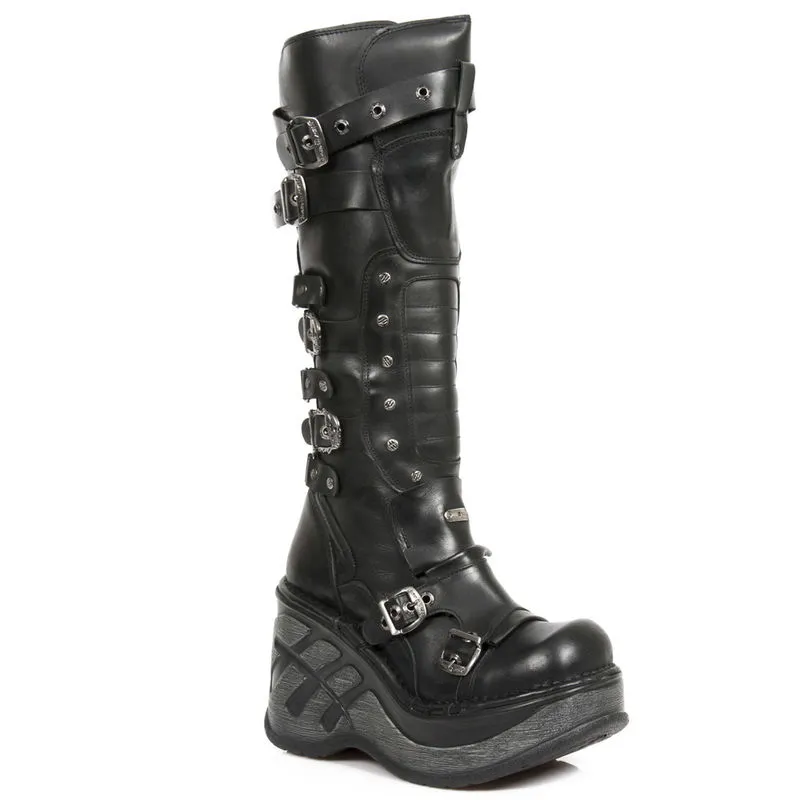 Une vraie bombe ! Cette paire de New Rock est dans le pur esprit goth, grosses semelles compensées de 5 cm et 12 cm au talon, nombreuses sangles de réglages avec boucles en forme de skull, rivets métalliques de décoration