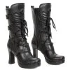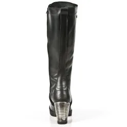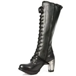 Grandes bottes en cuir noir new rock avec talon mĂ©tal trĂšs original, le grand laçage Ă l’avant lui donne un style gothique, fermeture Ă©clair intĂ©rieure