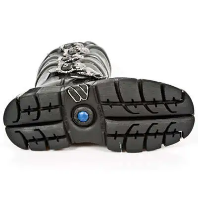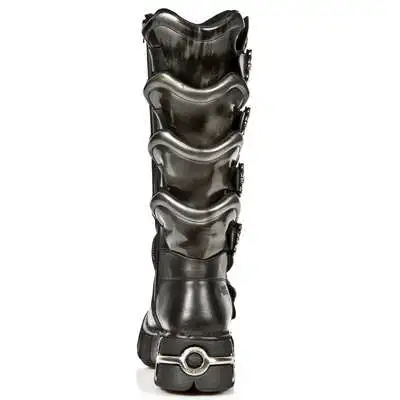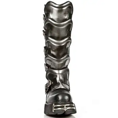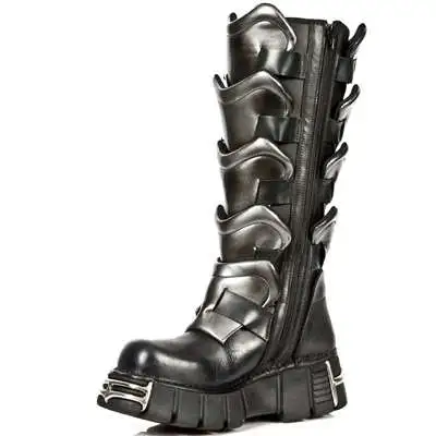 Grandes bottes avec semelles compensĂ©es ‘tower’ de 5 cm, 5 sangles avec boucles mĂ©talliques “skull”, tout l’esprit New rock dans ce modĂšle !