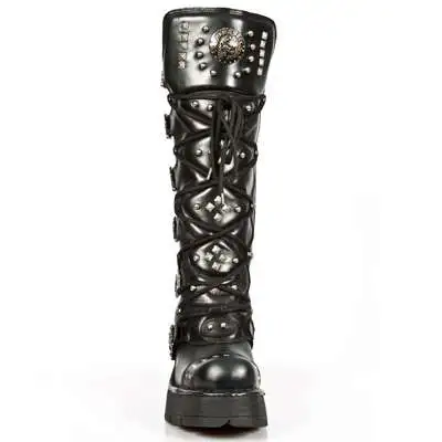 Bottes ornĂ©es de boucles ‘tĂȘtes de mort’ et de nombreux rivets, grand laçage frontal