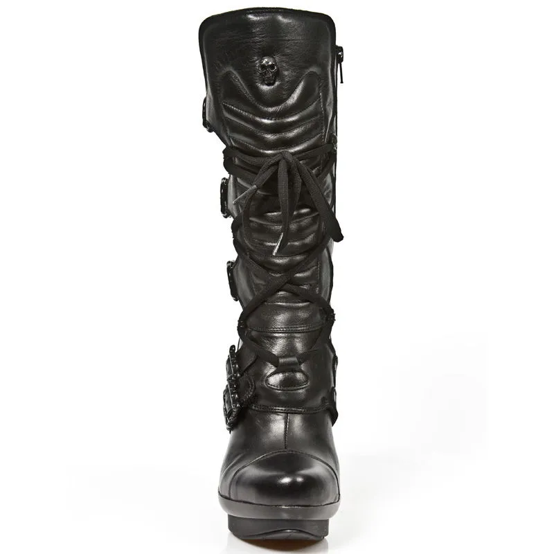 Superbes bottes en cuir New Rock. Contrairement Ă la plupart des chaussures New Rock, cette paire est entiĂšrement composĂ©e de noir, du haut de la botte jusqu’au talon, parfaites pour un total look black. Une languette en cuir matelassĂ© est prĂ©sente sur le devant de la botte, et s’attache grĂące Ă des boucles en forme de tĂȘtes de mort ainsi que des lacets. Cependant une fermeture Ă©clair est prĂ©sente sur le cĂŽtĂ© intĂ©rieur pour vous faciliter l’enfilage. Le talon aiguille ne doit pas vous faire pĂąlir car une plateforme est lĂ pour vous faciliter la vie et vous apporter un confort incomparable !