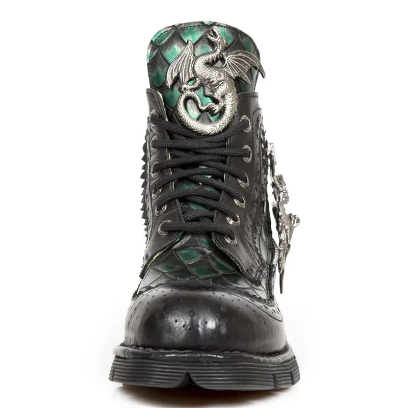 Le moins que l’on puisse dire c’est qu’elles en jettent non ? Ces bottines en cuir noir et vert sont agrĂ©mentĂ©es de deux gros dragons en mĂ©tal