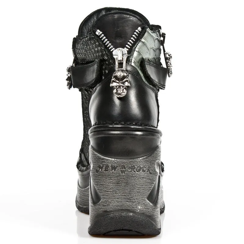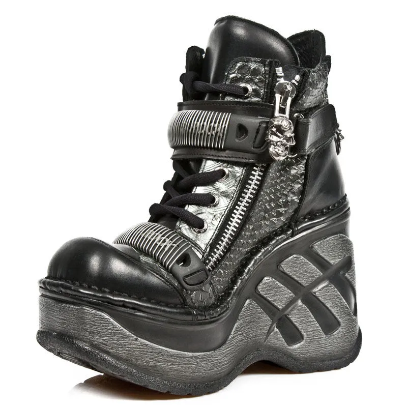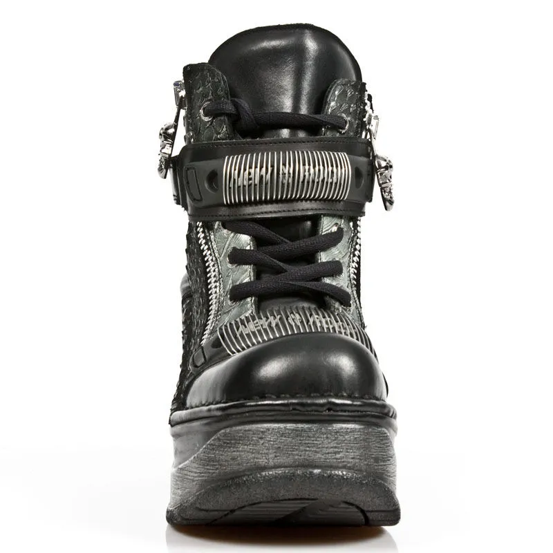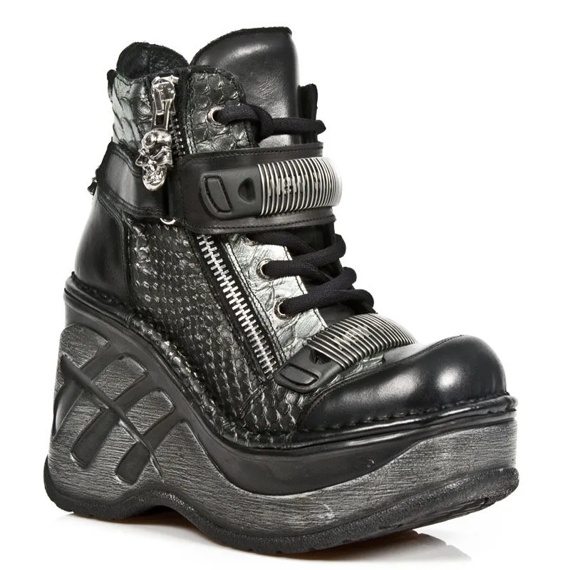 Superbes bottines en cuir noir et gris avec grosses semelles compensées de 5 cm et 12 cm au talon