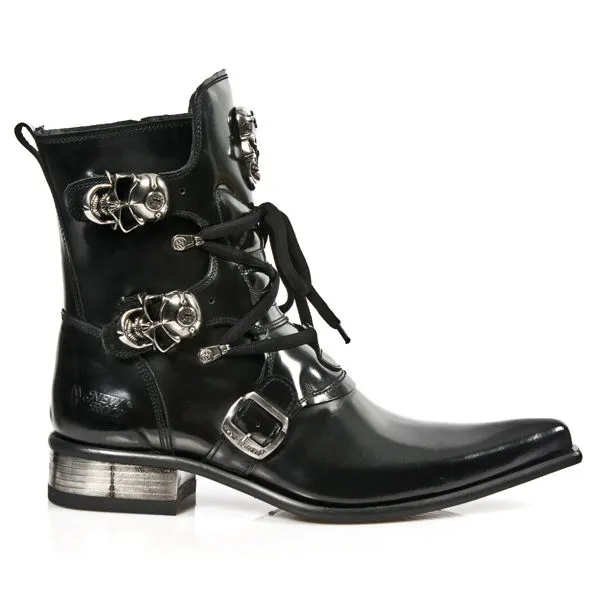 Superbes bottines Ă lacets et bout pointu New Rock pour hommes. Ce cuir vernis noir sublime Ă merveille cette chaussure qui est Ă la fois Ă©lĂ©gante et originale. On retrouve le cĂŽtĂ© gothique dans les boucles en forme de tĂȘtes de mort qui servent d’attaches aux sangles de la grosse languette sur l’avant de la botte. Cette languette en cuir matelassĂ© est ornĂ©e d’une tĂȘte de mort similaire en mĂ©tal, qui vient rappeler ce talon mĂ©tallique emblĂ©matique de la marque New Rock. MalgrĂ© les lacets, vous pouvez les enfiler facilement grĂące Ă la fermeture Ă©clair disposĂ©e sur le cĂŽtĂ© intĂ©rieur.