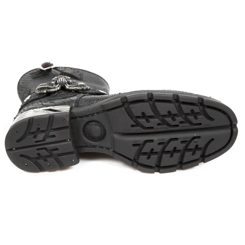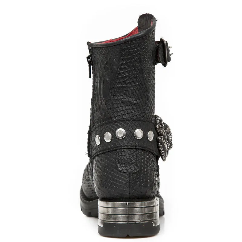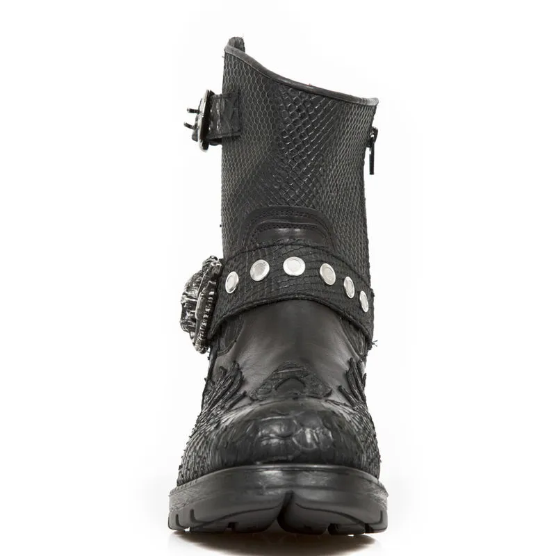 Magnifiques bottines en cuir New Rock, disponibles du 36 au 47, convenant pour hommes et pour femmes. Ces chaussures sont entiĂšrement fabriquĂ©es de cuir lisse et d’empiĂšcements de cuir effet peau de crocodile, qui s’ajustent en forme de flammes sur l’avant du pied. Une autre originalitĂ© de cette botte est cette incroyable boucle en mĂ©tal en forme de tĂȘte de mort sur le cĂŽtĂ© extĂ©rieur, qui vient rappeler l’icĂŽnique talon mĂ©tallique de la marque New Rock. Vous disposez d’une fermeture Ă©clair sur le cĂŽtĂ© intĂ©rieur de la chaussure afin de pouvoir l’enfiler avec plus d’aisance !