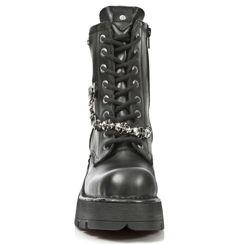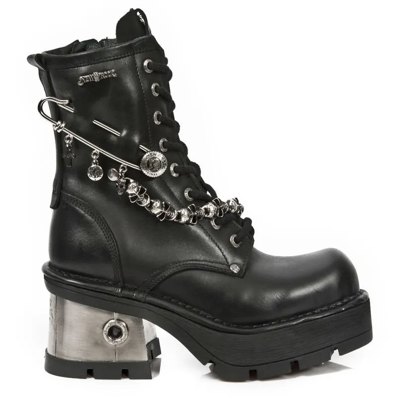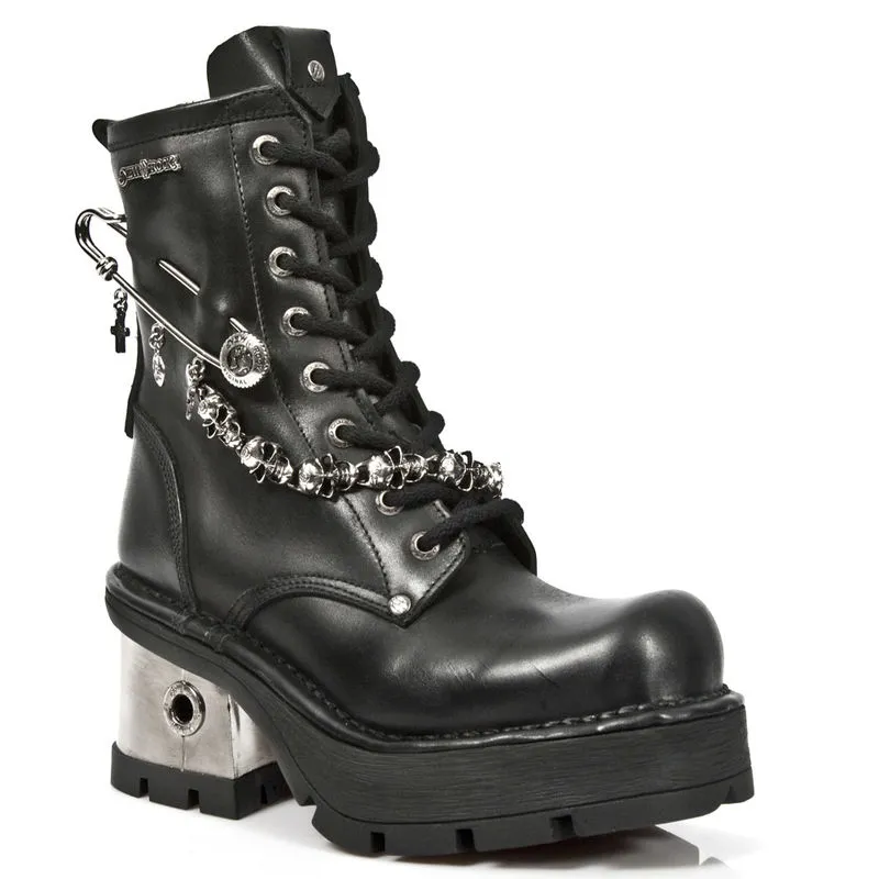 Bottines punk-rock ou goth c’est Ă vous de choisir , de belle qualitĂ© ces bottines vous sĂ©duiront par leurs dĂ©coration façon punk avec sa chaĂźne sur l’avant et son Ă©pingle Ă nourrice sur le cotĂ©,  vous noterez aussi le talon en mĂ©tal et la semelle compensĂ©Â