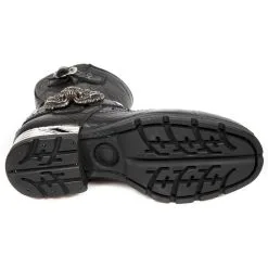 Avec son superbe cuir noir d’aspect lĂ©gĂšrement vieilli, ces bottines respirent la qualitĂ©, elle sont agrĂ©mentĂ©es d’un gros skull en mĂ©tal montĂ© sur une sangle traversante