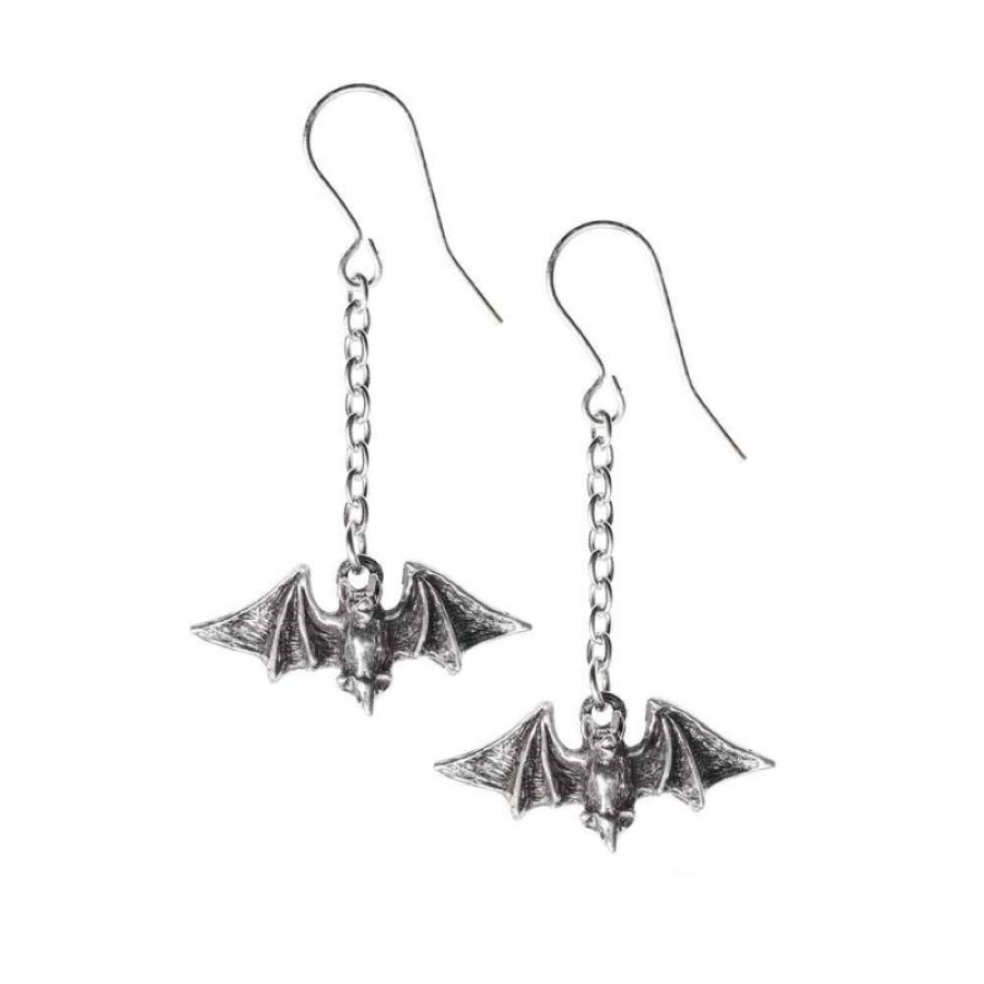 Une petite paire de chauve-souris volantes, boucles d’oreilles compte-gouttes en Ă©tain suspendues Ă une fine chaĂźne
