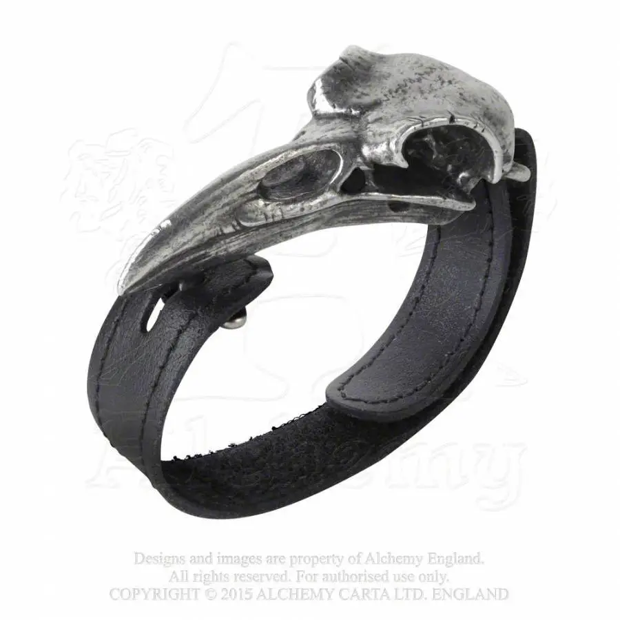 Bracelet gothique  en cuir ornĂ© d’une grosse tĂȘte de corbeau en Ă©tain vieilli , fermeture rĂ©glable par scratch.
