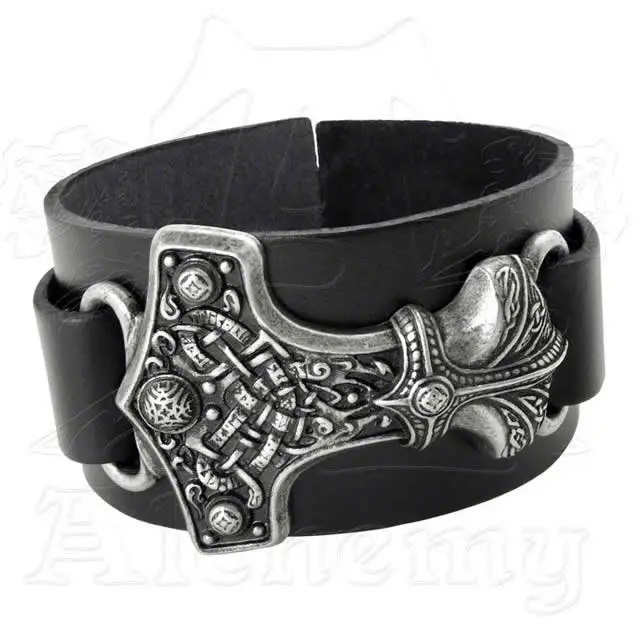 Large bracelet en cuir ornĂ© du fameux marteau de Thor en alliage d’Ă©tain vieilli façon antique et finement ciselĂ©.