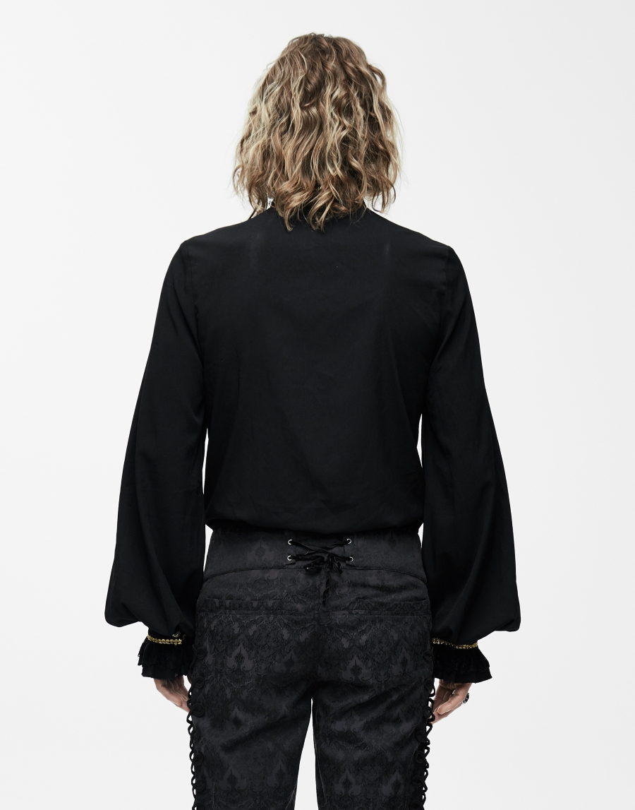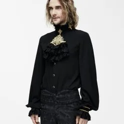 Belle chemise à jabot amovible décorée de liserets, broderies et bijoux couleur or, manches amples, elle est agrémentée de dentelle au col, au jabot ainsi qu’en bout de manches, les boutons de fermetures noir et or apportent une touche de grande classe à ce modèle