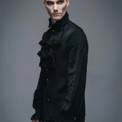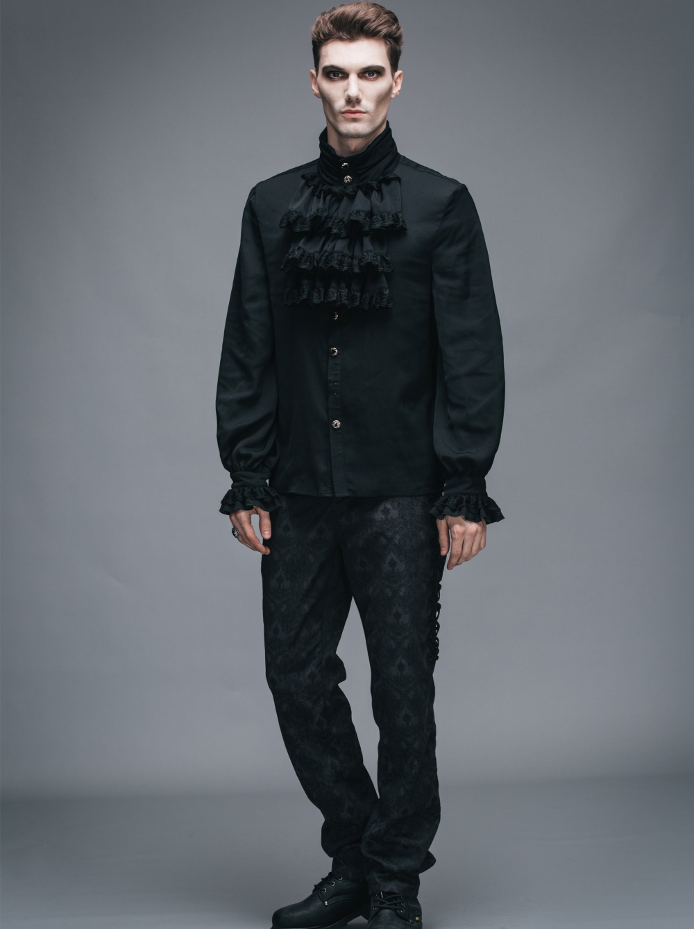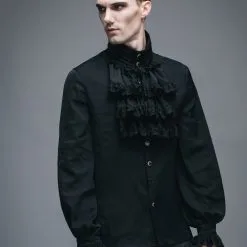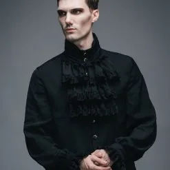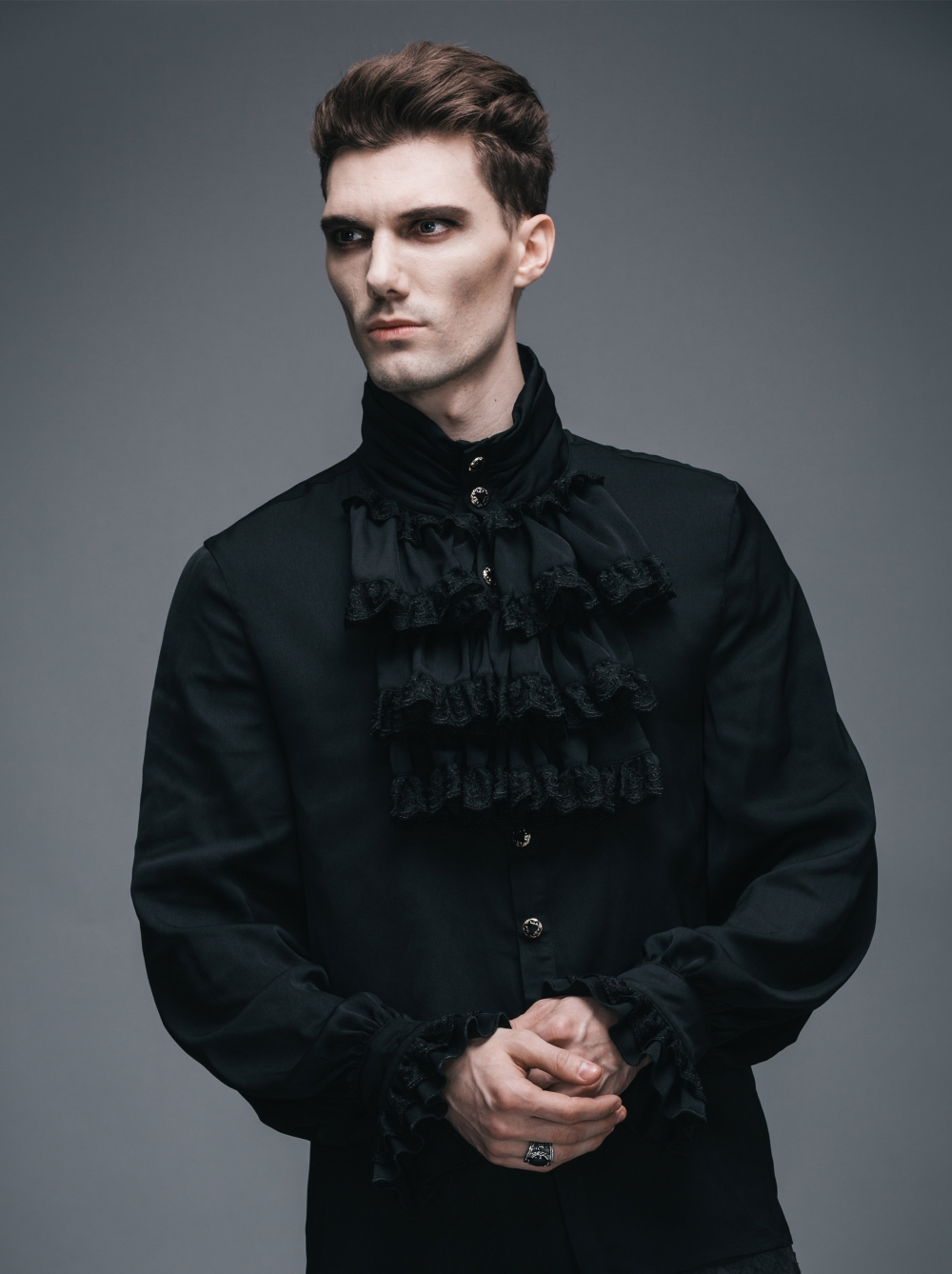 Cette superbe chemise gothique noire à jabot est agrémentée de fine dentelle et possède de beaux boutons de fermeture.La coupe est assez ample dans l’esprit XIX ème, tissu de grande qualité fin et souple.