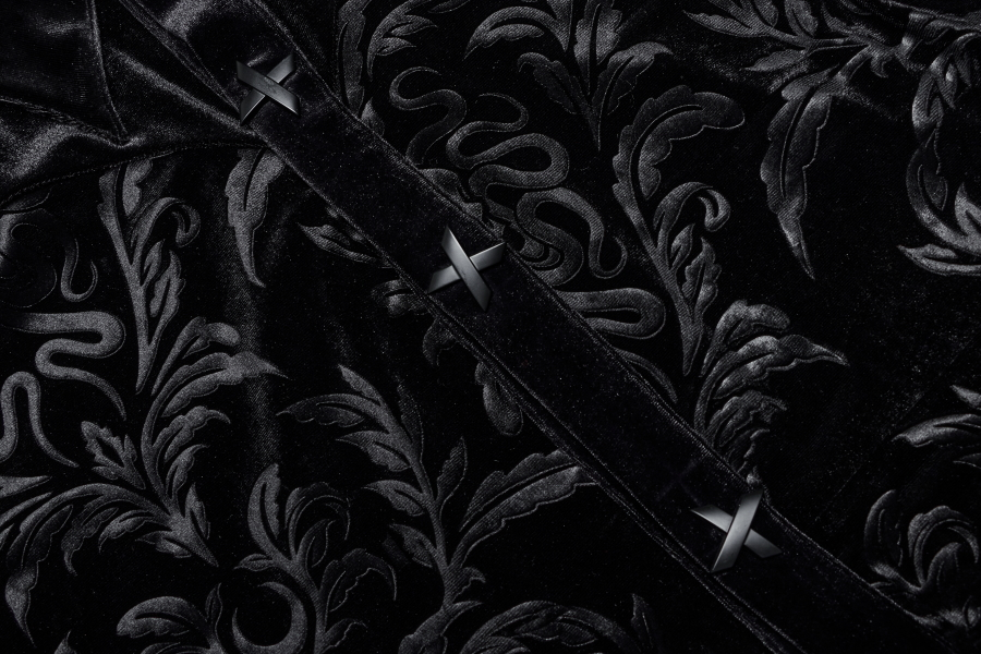 Le velours est imprimé en relief de motifs Cthulhu et floraux ton sur ton, le rendu est somptueux