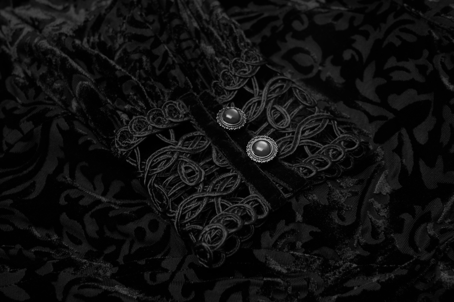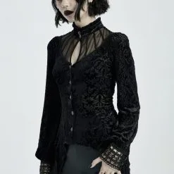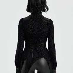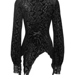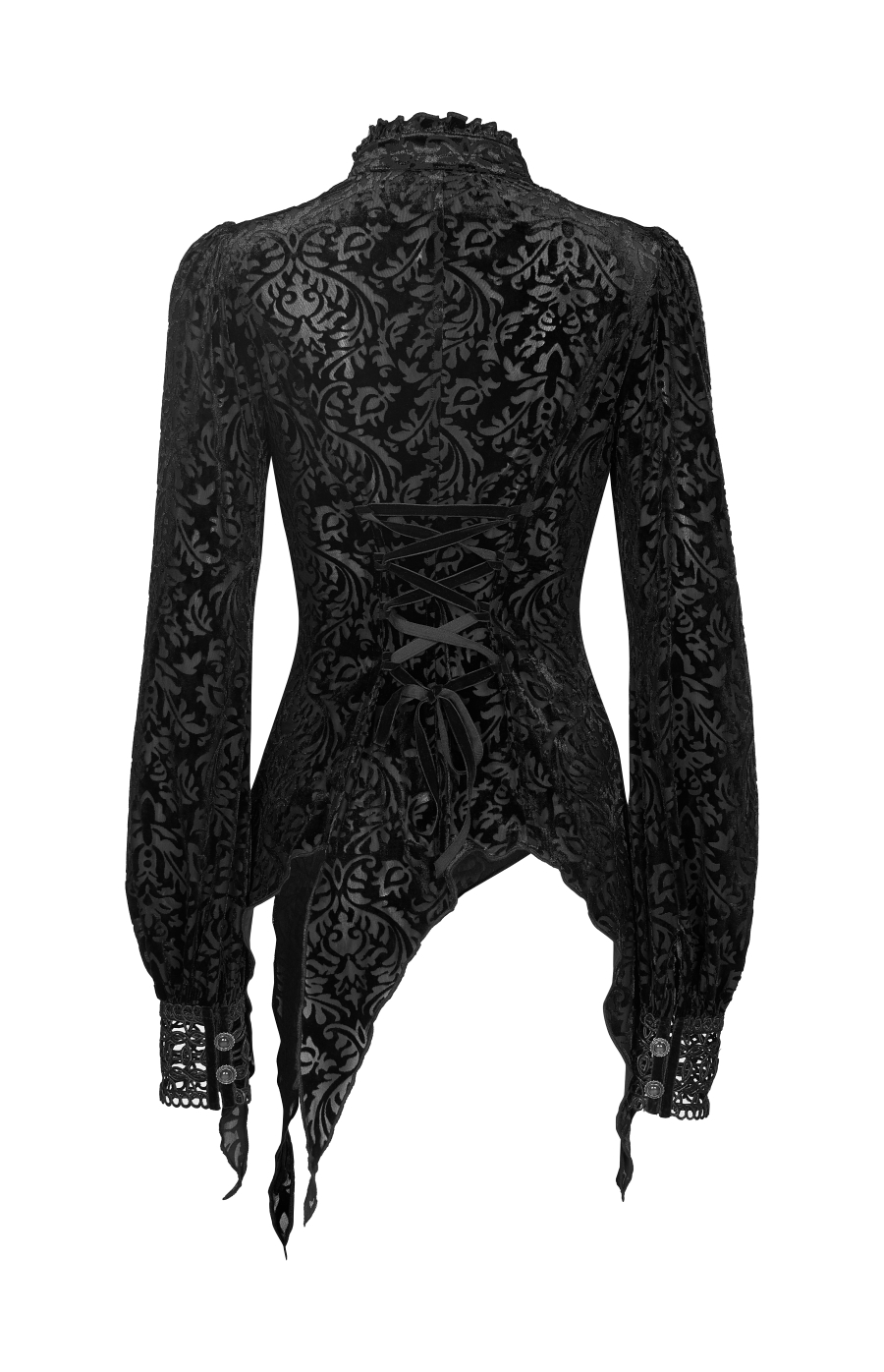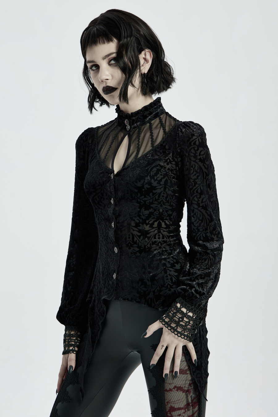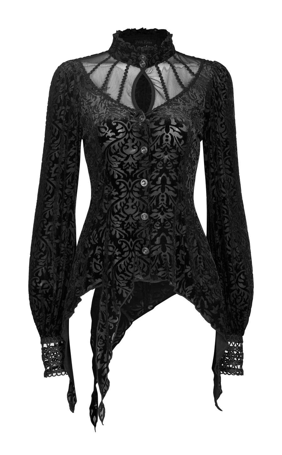 Ce chemisier signé Punk Rave est fabriqué dans un tissu léger légÚrement transparent floqué de motifs baroques en velours (burnt flocking)