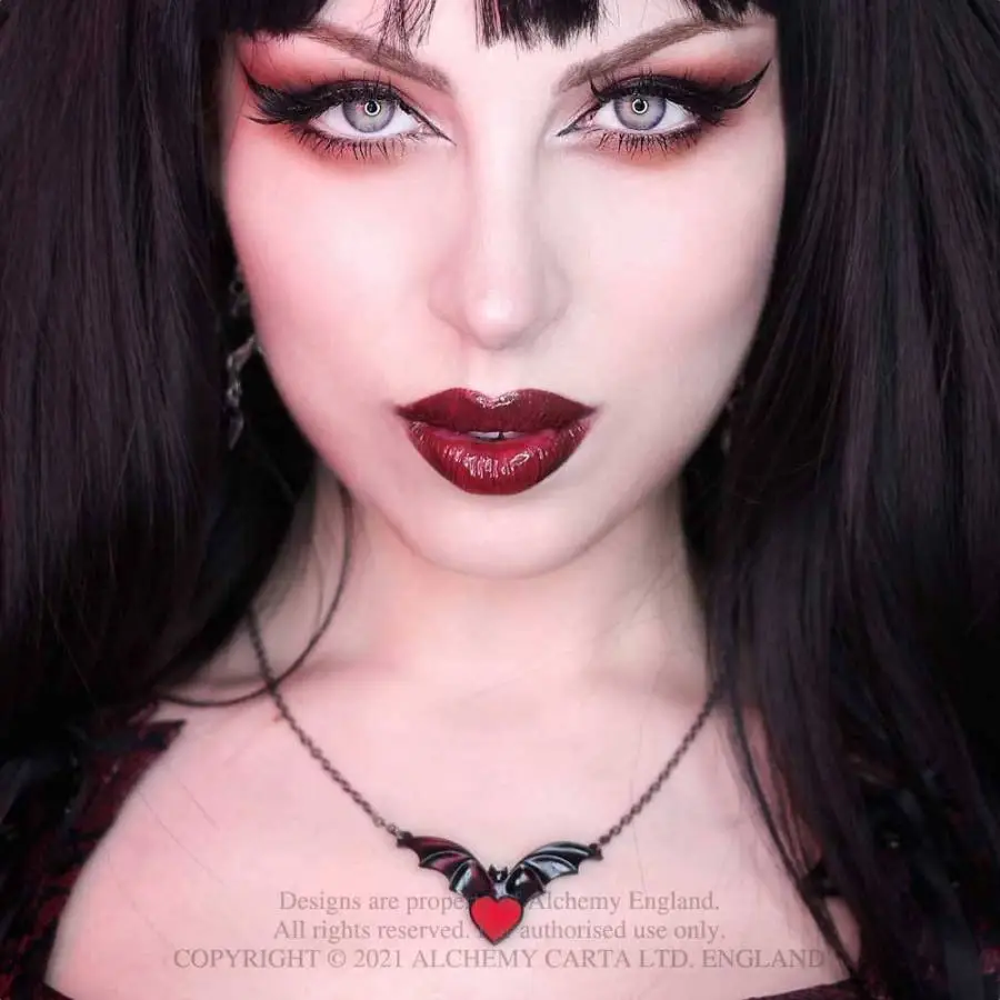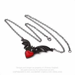 Très beau pendentif chauve-souris en étain noir avec un coeur incrusté d’émail rouge sang