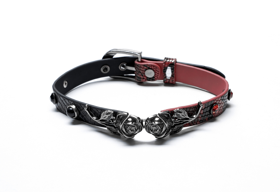 Ce collier bicolore, signé Punk Rave, est agrémenté de deux superbes roses en étain vieilli et finement sculpté