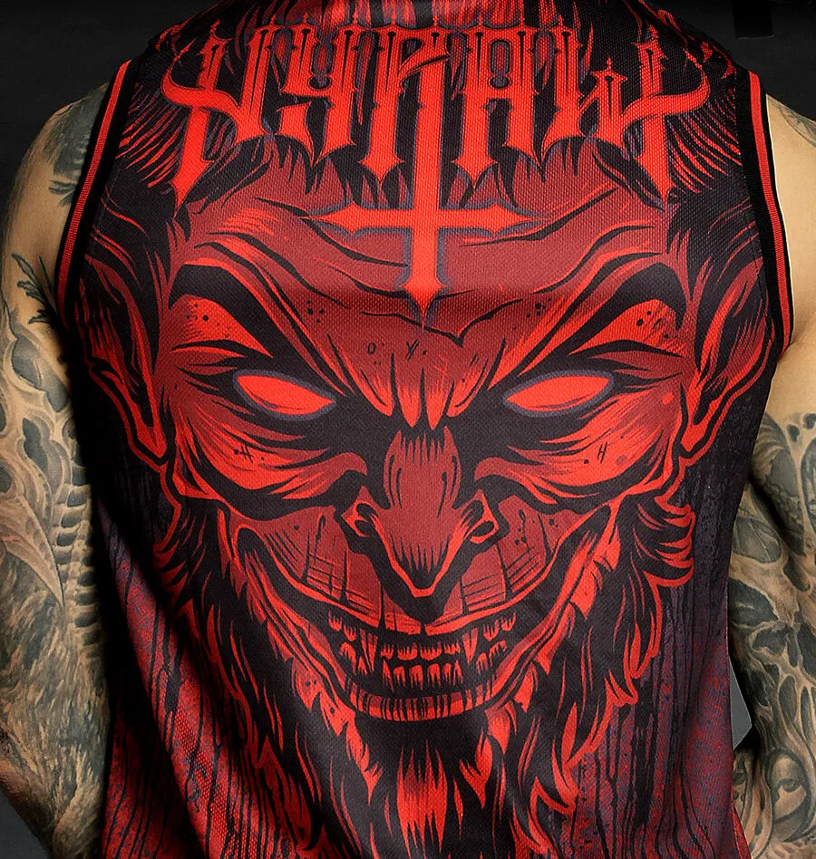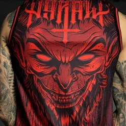 Au dos gros tête de Lucifer avec logo de la marque et croix inversée, du 100% satanique !