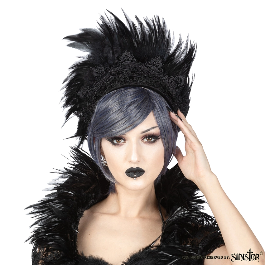 Ce couvre-chef gothique est orné de dentelle vénitienne noire et de dentelle brocade en forme de feuille à l’avant et à l’arrière.