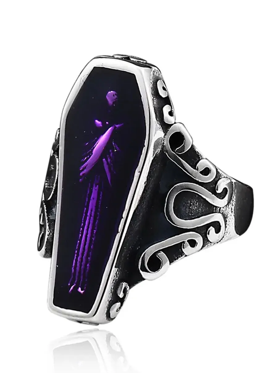 Bague gothique en forme de cercueil avec un squelette Ă l’intĂ©rieur sur fond violet