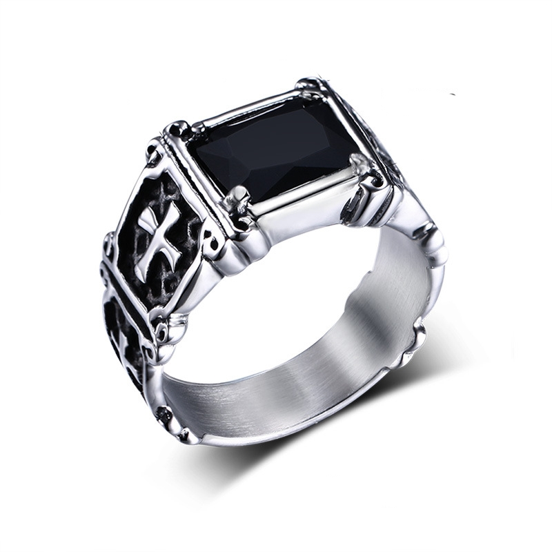 Petite bague fine en inox poli miroir dĂ©corĂ©e d’une pierre rectangulaire noire en zirconium, de petites croix gothiques viennent embellir les cĂŽtĂ©s