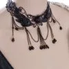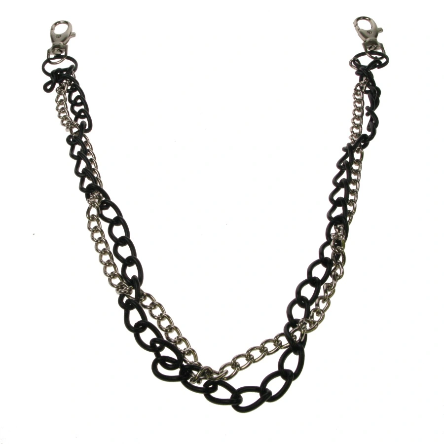 Double chaîne en métal noir et chrome, les maillons chromés de 1 cm sont entrelacés avec les maillons noirs de 1.5 cm, 2 mousquetons.