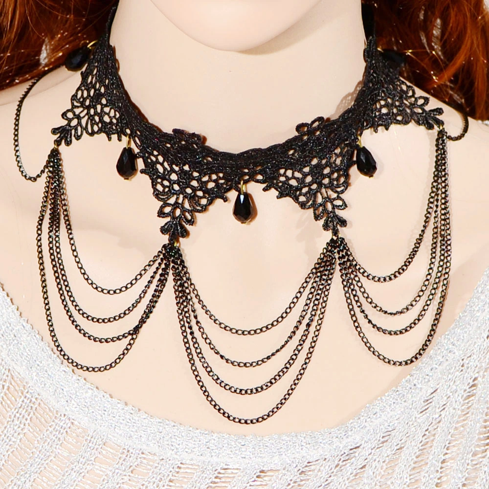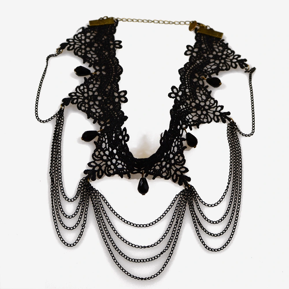 Beau collier gothique en tissu broderie orné de nombreuses chaßnettes et de petites pierres noires, un modÚle au rendu somptueux pour un tout petit prix