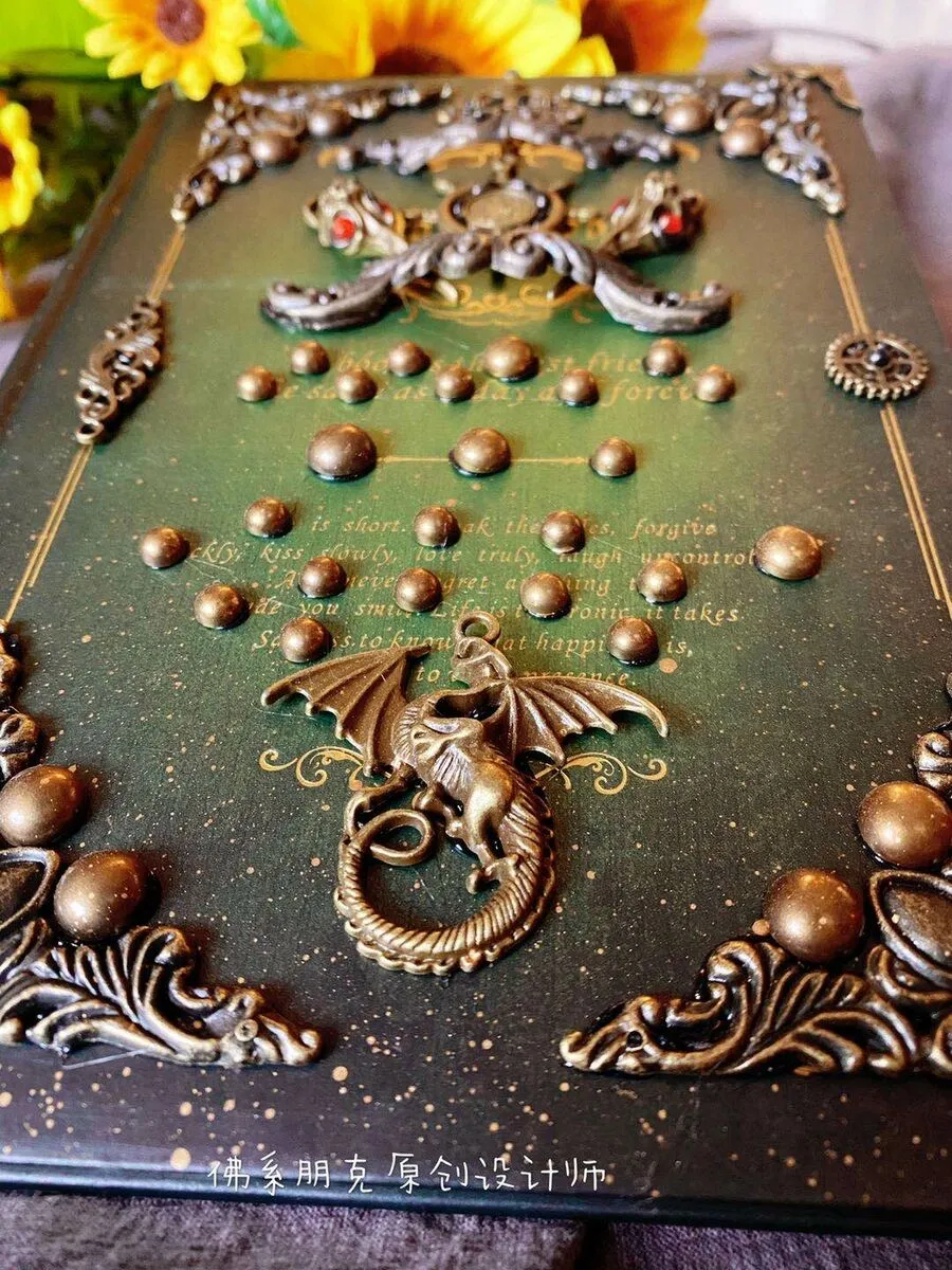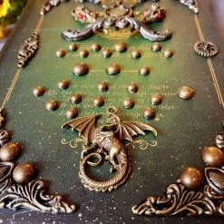 Couverture rigide verte ornée de piÚces de cuivre avec notamment un dragon et des crùnes de corbeau