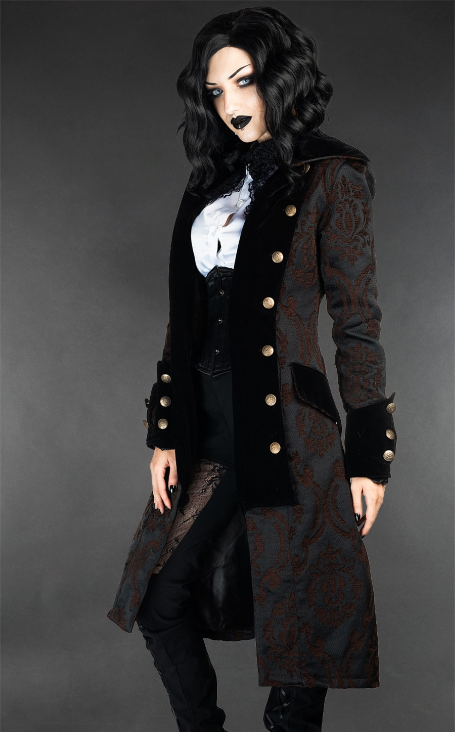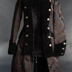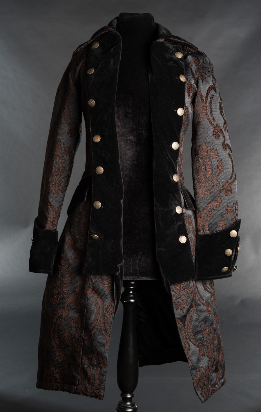 TrÚs beau manteau victorien de style pirate taillé dans un tissu jacquard noir décoré de motifs baroques marrons