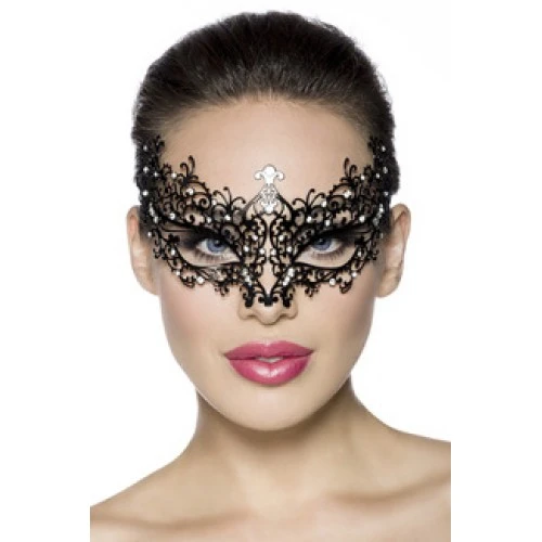 Masque gothique noir en métal finement ciselé et orné de nombreux strass, il s’attache par un petit ruban de satin et sera le compagnon de tous vos bals !