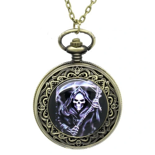 Surprenant mélange pour cette montre à gousset couleur cuivre antique, avec the reaper sur la face avant. Mouvements à quartz comme une montre traditionnelle