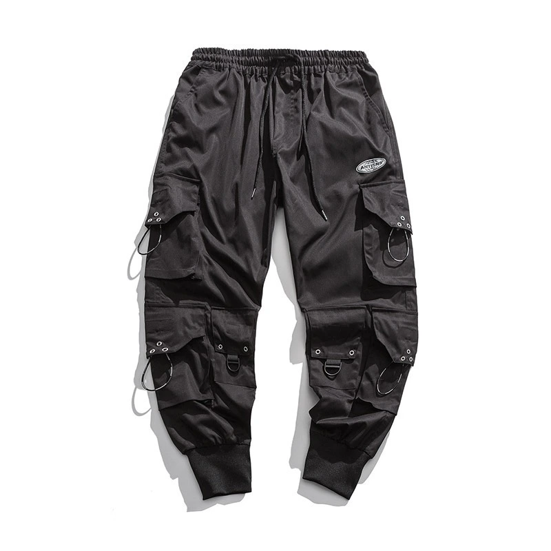 Pantalon techwear noir type cargo fabriqué dans une toile fluide et légÚre