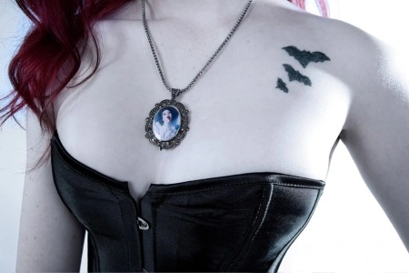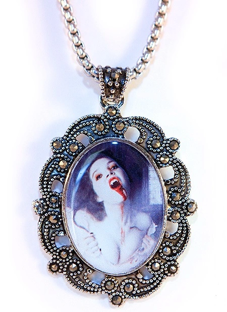 Pendentif vampire en acier inoxydable et marcassite représentant une femme vampire assoifée de sang, il est signé par Avelina de Moray