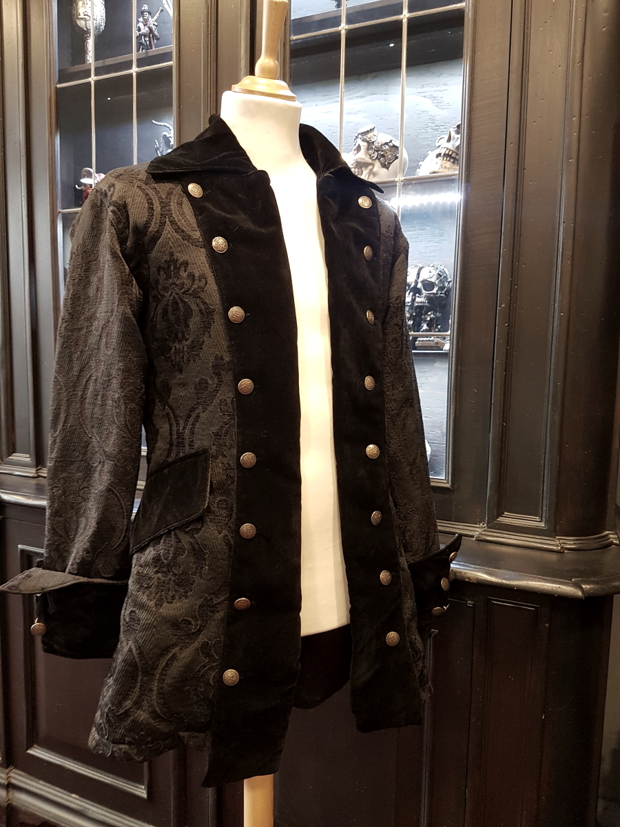 Belle veste victorienne de style pirate taillĂ©e dans un tissu jacquard noir aux motifs baroquesÂ