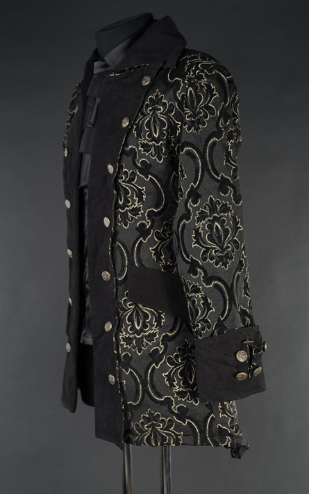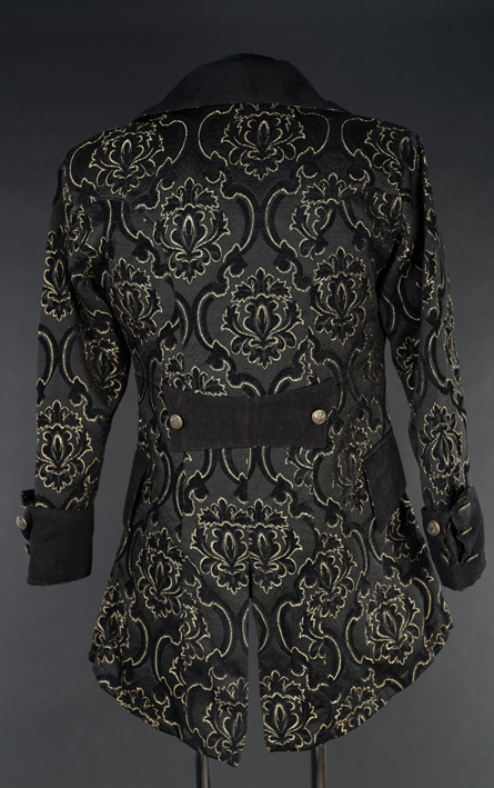 Belle veste victorienne de style pirate? taillée dans un tissu jacquard noir aux motifs baroques couleur or