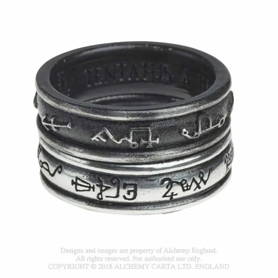 L’anneau noir contient les signatures de sept esprits ou anges mĂ©diĂ©vaux, statut de «dĂ©mon» diversement acclamĂ© par les mystiques du passĂ©; Dagon, Azervial, Adatiel, Cassiel, Camriel, Adnachiel et Anael. Ă l’intĂ©rieur de celui-ci est gravĂ© TENTATUS A DAEMONIBUS, «TEMPTED BY DEMONS».