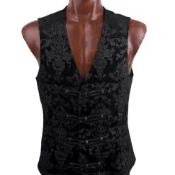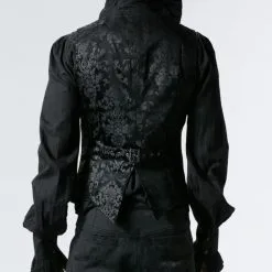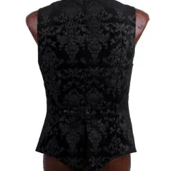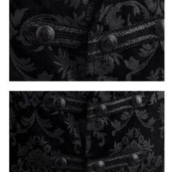 Gilet gothique sans manches de style victorien en tissu brocarde, fermeture par boutons pressions ornĂ©s de belles broderies, 2 petites poches Ă l’avant, sangle de dĂ©coration dans le dos, doublure intĂ©rieure en satin.