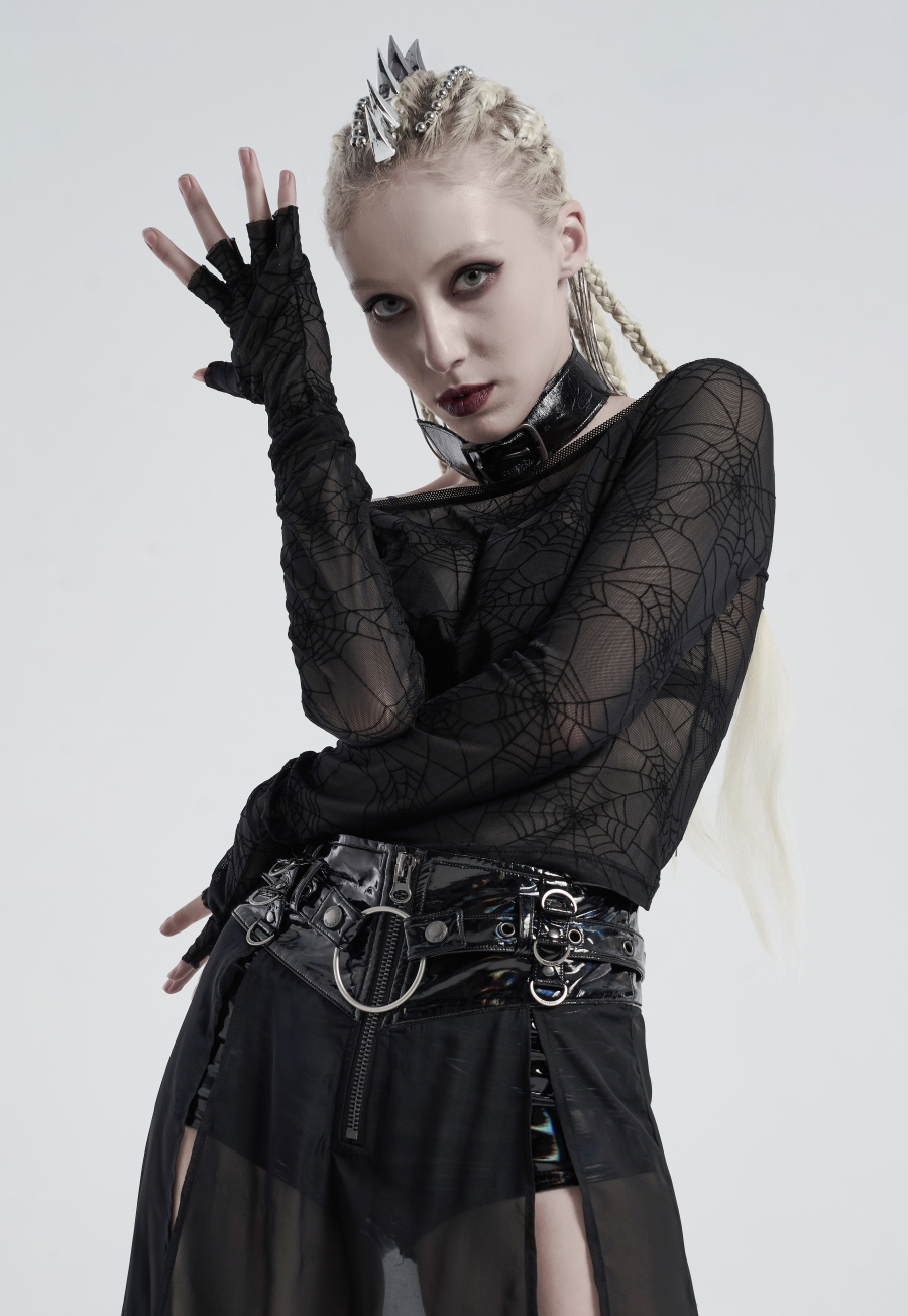 Dans un pur style gothique ce haut en tissu résille est décoré de toiles d’araignées