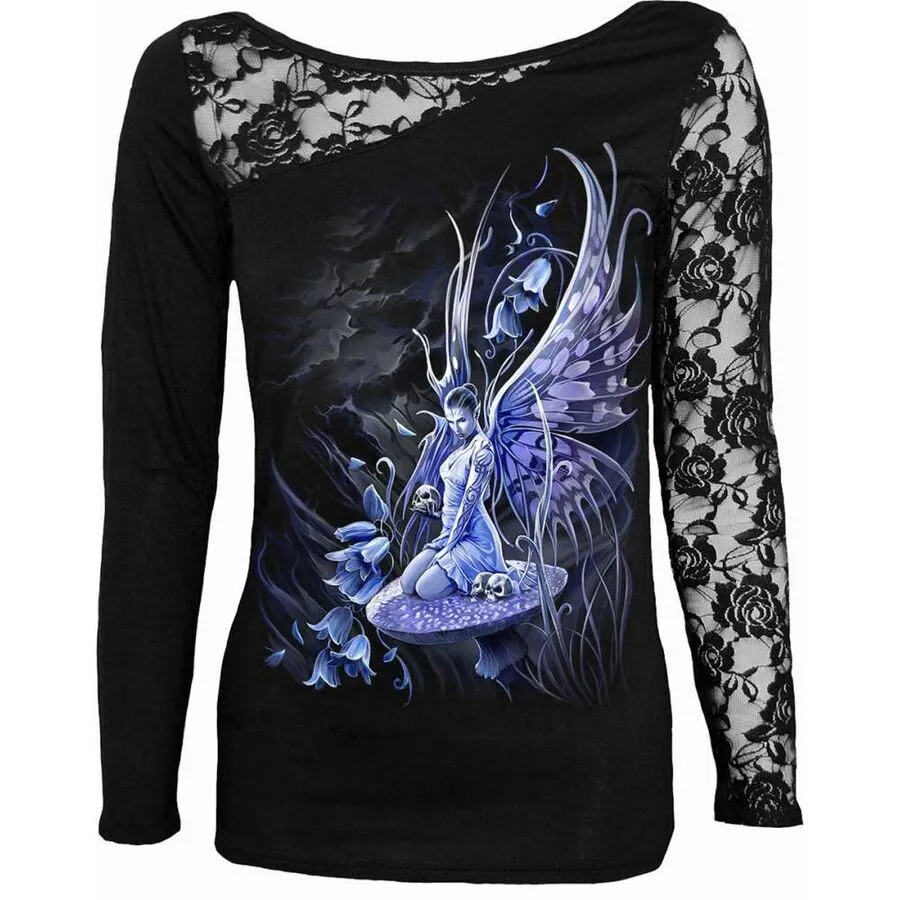 Solennellement agenouillĂ©e sur un champignon vĂ©nĂ©neux au clair de lune, sous un ciel tumultueux, une guerriĂšre fĂ©e solitaire pleure l’extinction continue de sa race