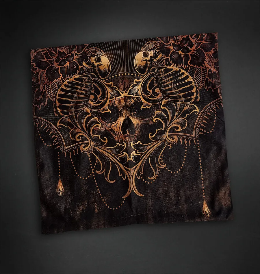 1 face avec deux squelettes formant un coeur et un Ă©norme crĂąne au centre et de l’autre le mĂȘme design sans le crĂąne et sur un ton diffĂ©rent